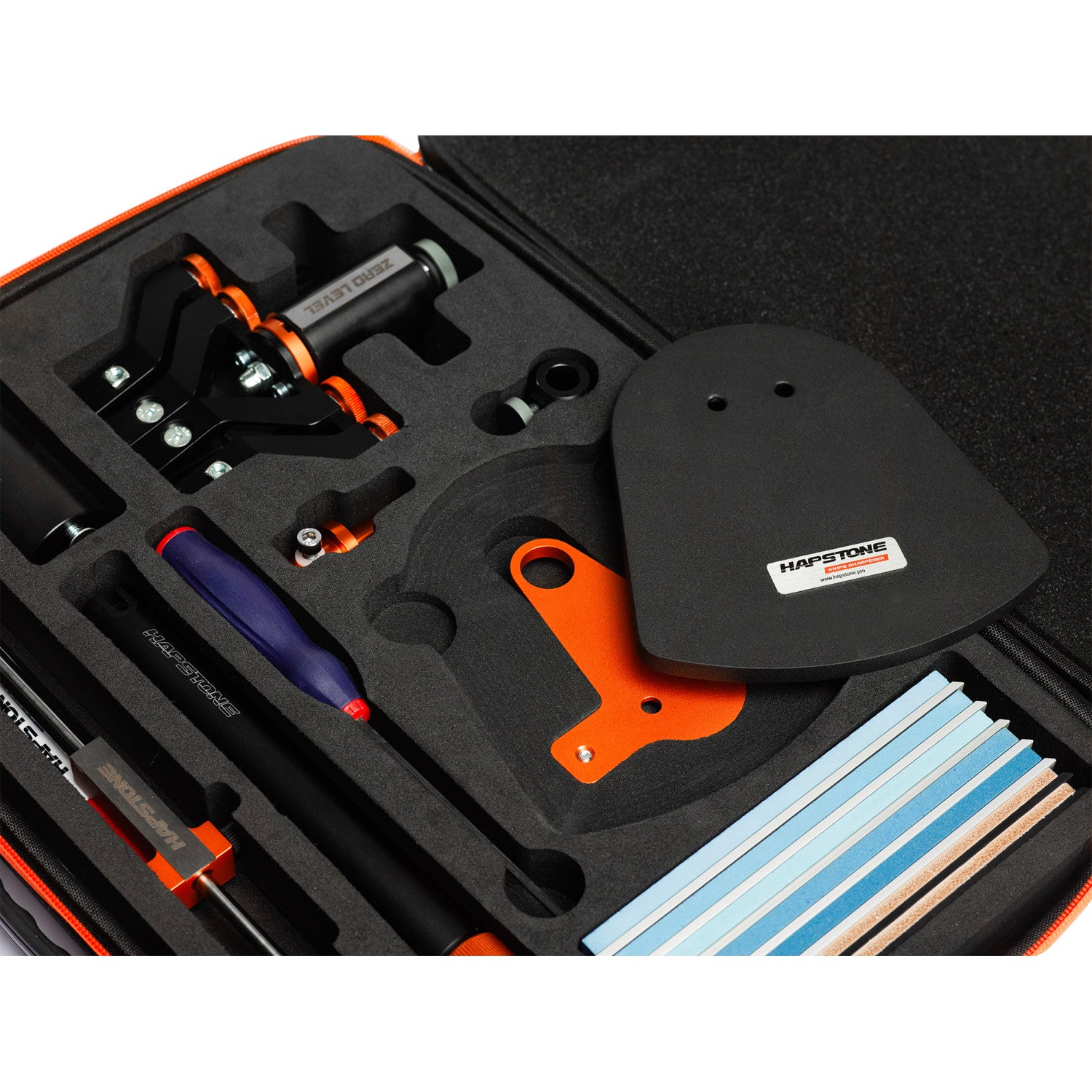 Die Tasche bietet auch Stauraum für eine Winkelanzeige, einen Schraubendreher und alle Zubehörteile des Hapstone RS 4-Klemmen-Messerschärfsystems, einschließlich des Präzisions-Winkeljustierers für Hapstone RS.